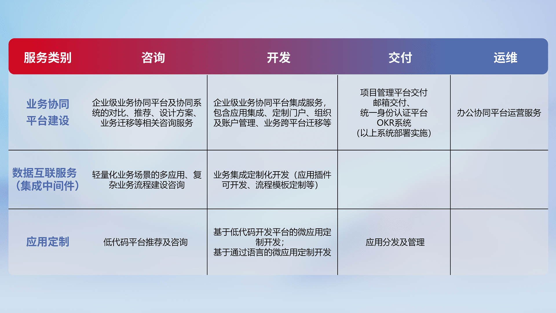 针对钉钉、、、企微、、IDaas等平台级产品提供产品的规划、、方案、、交付、、、定制化开发等服务,,,实现如统一协同办公、、、智能客户服务、、、混合会议管理、、、智能数据查询、、、等业务场景,,,,实现数字化转型。。