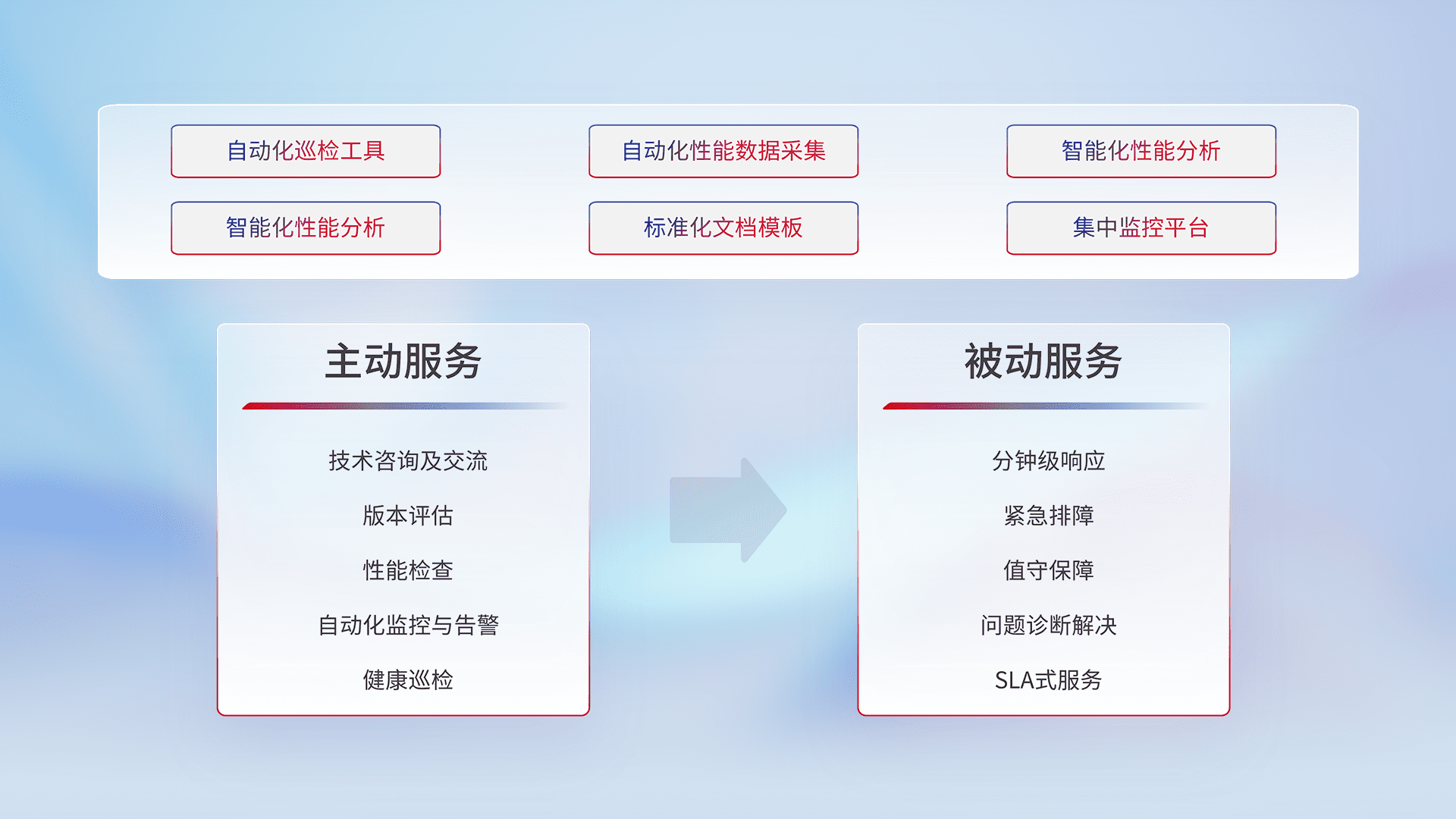 智能化工具和标准化文档,,保障服务质量,,,提供主动服务(包含技术咨询、、、、版本评估、、性能检查、、自动化监控与告警、、、、健康巡检)和被动服务包含(分钟级响应、、、紧急排障、、、、值守保障、、问题诊断解决、、、SLA服务)。。