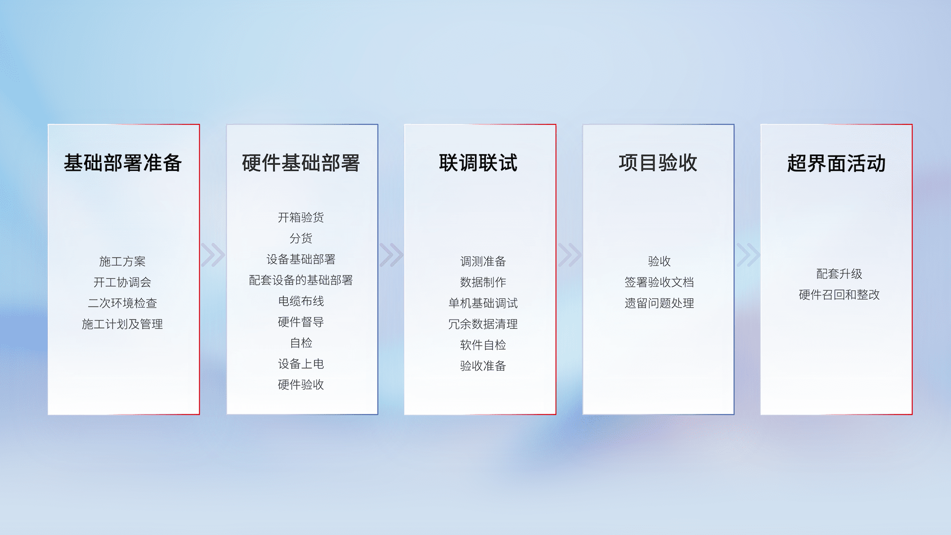 从基础部署准备、、硬件基础部署、、联调联试、、、项目验收、、、越界面活动的全过程可追溯,,,保证施工质量和进度。。。。